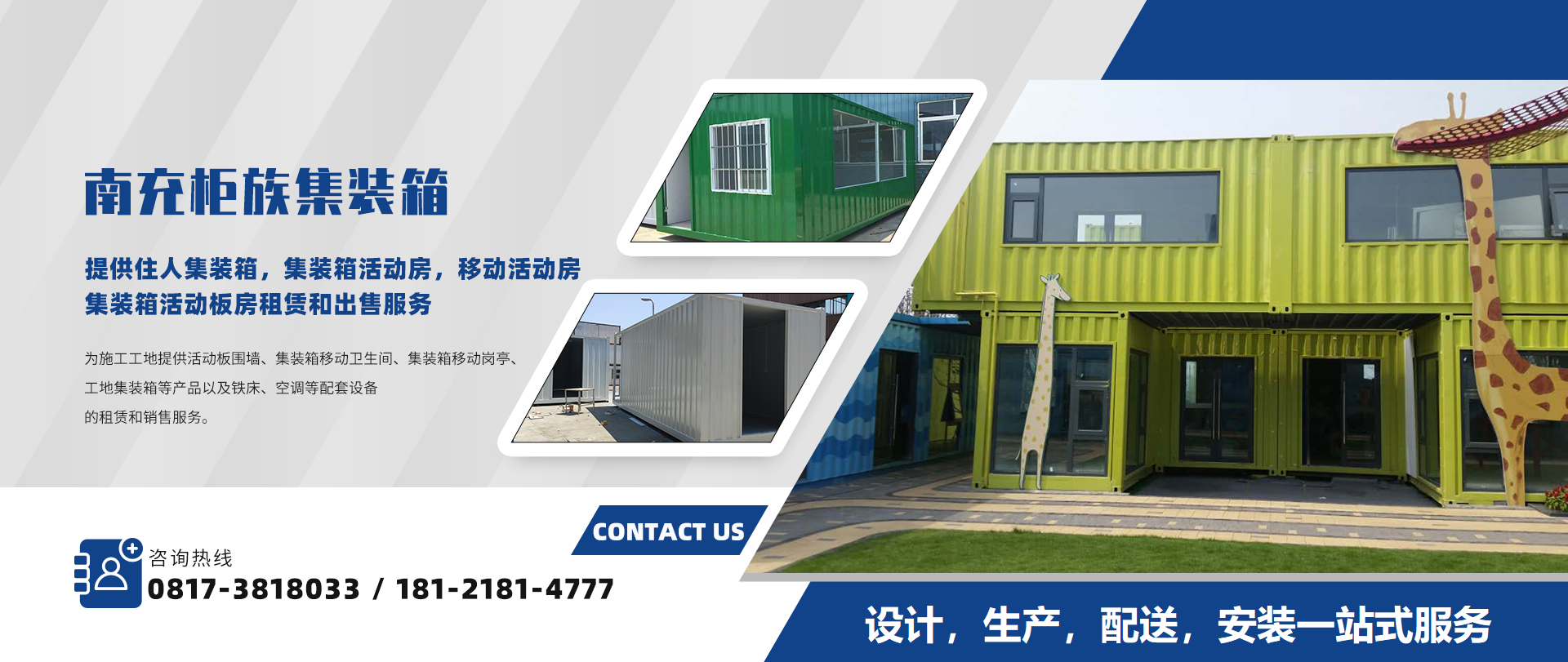 南充柜族集裝箱有限公司是一家為南充/遂寧/閬中/營山/蓬安/南部/西充等周邊城市提供住人集裝箱,集裝箱活動房,移動活動房,集裝箱活動板房服務!本公司專業(yè)服務南充住人集裝箱、南充移動活動房、南...